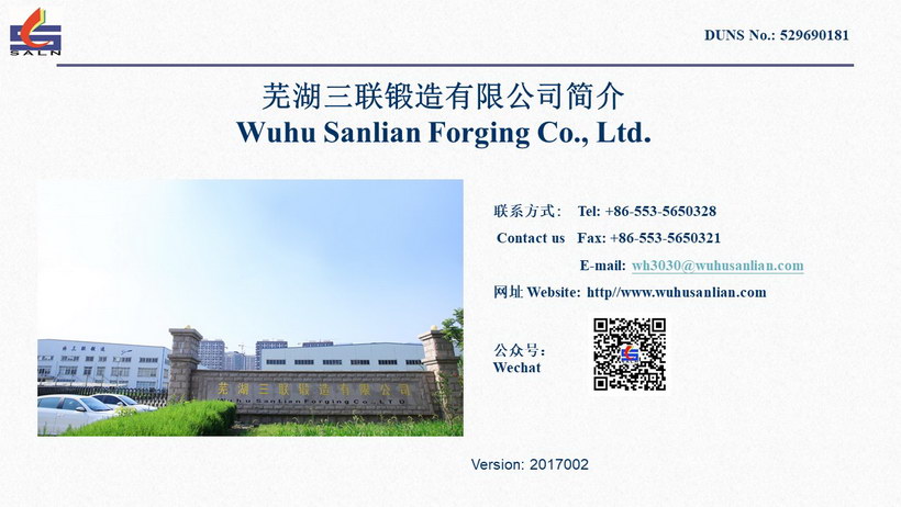 蕪湖三聯(lián)鍛造有限公司位于安徽省蕪湖市高新技術(shù)開發(fā)區(qū)內(nèi)。是一家專業(yè)從事汽車零件鍛造及機(jī)加工的民營(yíng)企業(yè),三聯(lián)公司總占地面積110畝,總投資2億元人民幣。鍛造生產(chǎn)線20條,年生產(chǎn)鍛件4萬(wàn)噸。