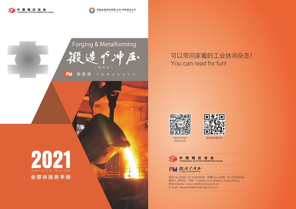 FM《鍛造與沖壓》由中國鍛壓協(xié)會主辦,是一本以市場需求為導向,集信息、技術、產(chǎn)品、市場與管理為一體的綜合性高端雜志。月發(fā)行量2.5萬冊,采取B2B發(fā)行模式,具有鍛壓行業(yè)針對性最強、覆蓋有效率最高的讀者群體,是中國鍛壓行業(yè)的領銜雜志媒體,受到國內(nèi)外廣泛的認可。
