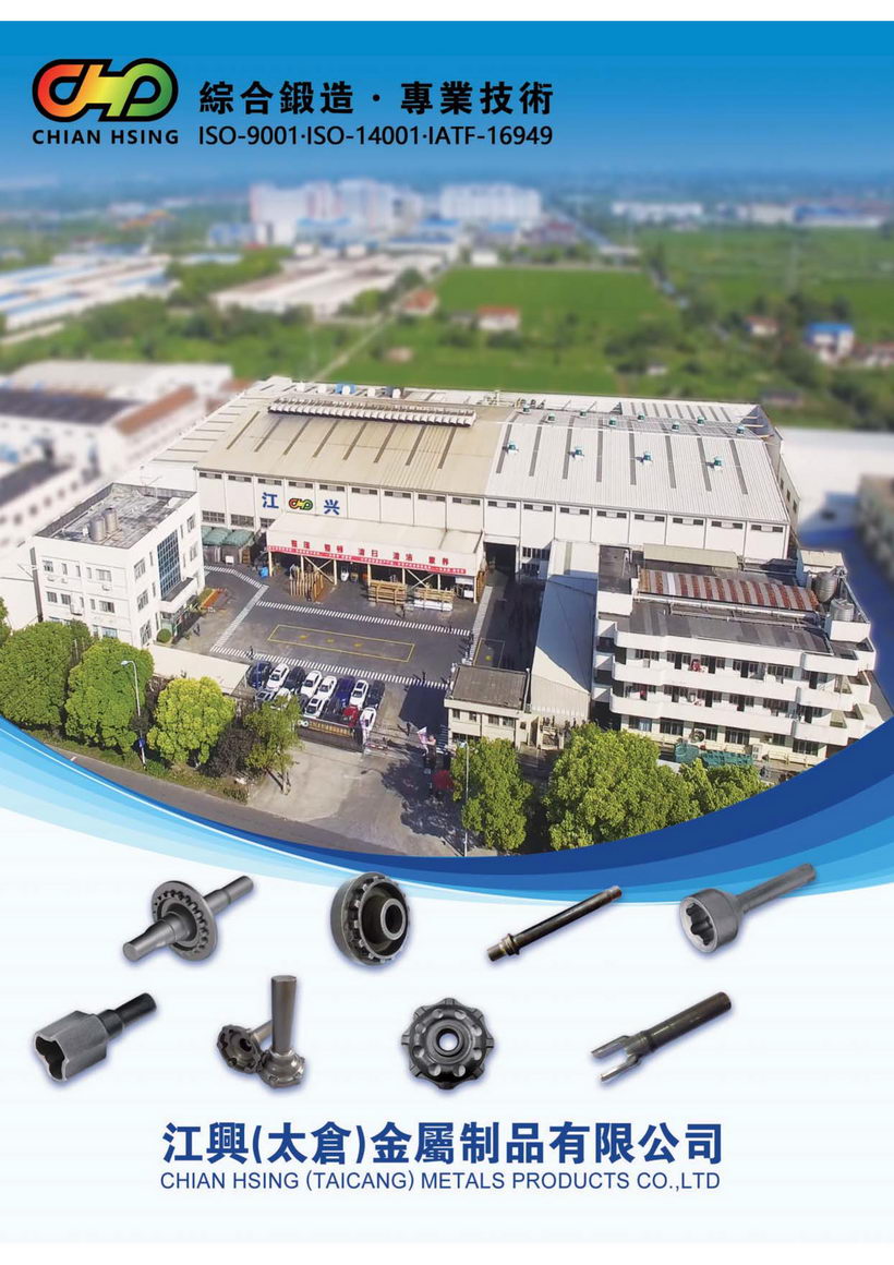 江興鍛壓工業(yè)股份有限公司自西元1971年創(chuàng)立以來(lái),秉持著「顧客滿(mǎn)意、同仁樂(lè)意、經(jīng)營(yíng)得意、永續(xù)經(jīng)營(yíng)」之經(jīng)營(yíng)理念,不斷開(kāi)發(fā)綜合鍛造之技術(shù),使本公司所生產(chǎn)的鍛品更優(yōu)良、更精密、更能減少切削加工,使鍛品更臻于理想。于1997年在江蘇省太倉(cāng)市設(shè)立江興(太倉(cāng))金屬制品有限公司,以及2012年設(shè)立江興(淮安)汽車(chē)部件有限公司,延續(xù)臺(tái)灣總部的經(jīng)營(yíng)理念和專(zhuān)業(yè)技能,持續(xù)在國(guó)內(nèi)發(fā)展并精進(jìn)冷溫?zé)峋C合鍛造技術(shù)。