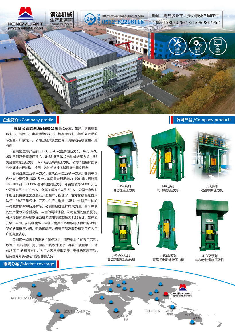 青島宏源泰機械有限公司是以研發(fā)、生產(chǎn)、銷售摩擦壓力機、碾環(huán)機、電液錘等系列產(chǎn)品的專業(yè)生產(chǎn)商。公司已經(jīng)成長為國內一流的鍛造機械生產(chǎn)服務商。近年來,除在國內的市場占有率不斷提高以外,公司開拓的東南亞、中東市場也取得了良好的業(yè)績,我們的摩擦壓力機、碾環(huán)機、電液錘類產(chǎn)品及服務得到了廣大用戶的高度認可。