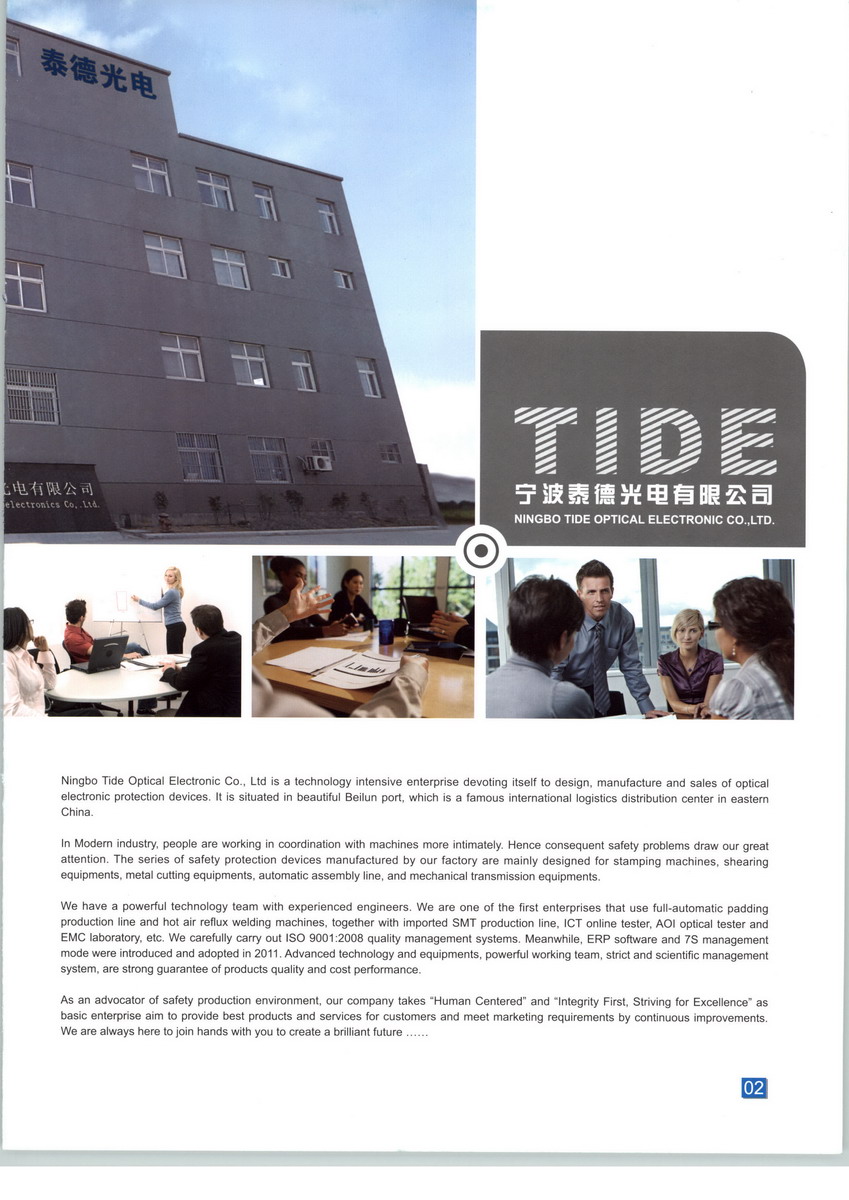 寧波泰德光電有限公司是專業(yè)從事光電保護裝置設(shè)計、生產(chǎn)和銷售的科技型企業(yè),坐落于美麗的東方大港北侖,是新興的國際物流集散中心現(xiàn)代化的工業(yè)企業(yè)中,人與機器更加密切的協(xié)同工作,安全問題隨之更加受到重視。我司生產(chǎn)的安全保護裝置主要適用于沖壓機械、剪切設(shè)備、金屬切削設(shè)備、自動化裝配線、機械傳送搬運設(shè)備等。 我司擁有一支強大的科技團隊,技術(shù)精湛,經(jīng)驗豐富,持續(xù)創(chuàng)新。我司率先在行業(yè)內(nèi)引進全自動貼片生產(chǎn)線和完善的檢測老化設(shè)備,并擁有進口SMT生產(chǎn)線,ICT在線測試儀,AOI光學(xué)測試儀,EMC實驗室等。公司認真貫徹ISO9001:2008質(zhì)量認證體系,2011年引進ERP軟件,并全面推行“7S”管理模式。先進的技術(shù)和設(shè)備,強大的科技團隊,嚴格的科學(xué)管理制度,是我司對高性價比產(chǎn)品的保證。 作為安全生產(chǎn)環(huán)境的維護者,我司本著“以人為本”的設(shè)計理念,“誠信第一,追求卓越”的企業(yè)宗旨,努力向客戶提供最好的產(chǎn)品,并通過持續(xù)改進,不斷適應(yīng)和滿足市場。同時,我們爭取用最好的服務(wù)來滿足客戶,感動客戶。我司殷切希望與您一起,攜手并進,創(chuàng)造更美好的明天。