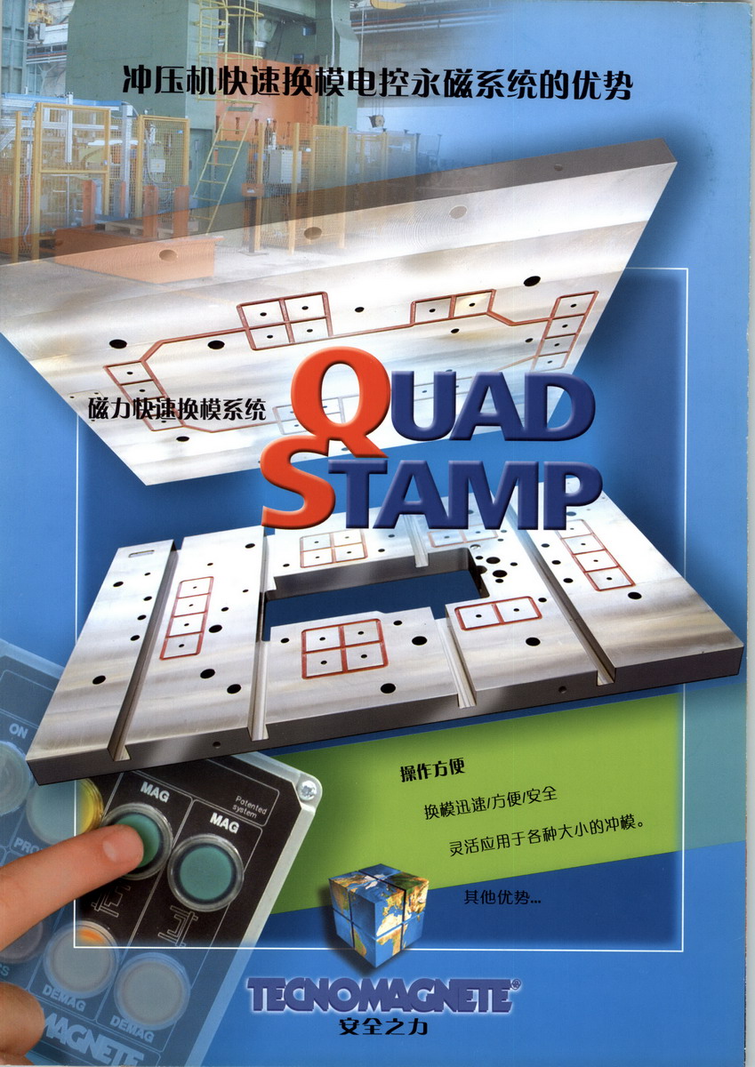 泰磁快速換模系統(tǒng)作為一個(gè)完整的解決方案用來(lái)滿足先進(jìn)的制造過(guò)程中小批量、多類別生產(chǎn)的JIT(實(shí)時(shí)生產(chǎn))和SMED(快速更換)的要求。 采用完美的“雙磁極對(duì)流”技術(shù),具有磁場(chǎng)集中,磁吸附力強(qiáng),不磁化設(shè)備,克服間隙能力強(qiáng),磁穿透高度可控等優(yōu)點(diǎn)。將電控永磁的磁力的應(yīng)用發(fā)回到極致。 意大利泰磁公司Tecnomagnete S.p.A.始建于1972年,是全球電控永磁產(chǎn)品領(lǐng)域中的領(lǐng)先公司,發(fā)明了一系列革命性創(chuàng)新產(chǎn)品,設(shè)計(jì)、制造全系列電控永磁夾持及吊重系統(tǒng)。產(chǎn)品包括:注塑機(jī)快速換模系統(tǒng)、銑削、磨削、立車、鐵軌加工用電控永磁夾盤、手動(dòng)永磁吊重器及重型電控永磁吊重設(shè)備(用于成卷鋼帶、大型鋼板等的吊運(yùn))等。