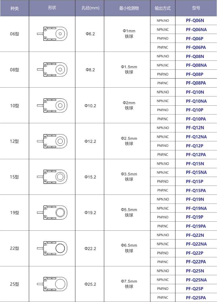 ECOTTER環(huán)型接近開關(guān)有多種規(guī)格可選,孔徑分別有6.2、8.2、10.2、12.2、15.2、19.2、22.2、25.2mm直徑,NPN\PNP開關(guān)量信號可選。