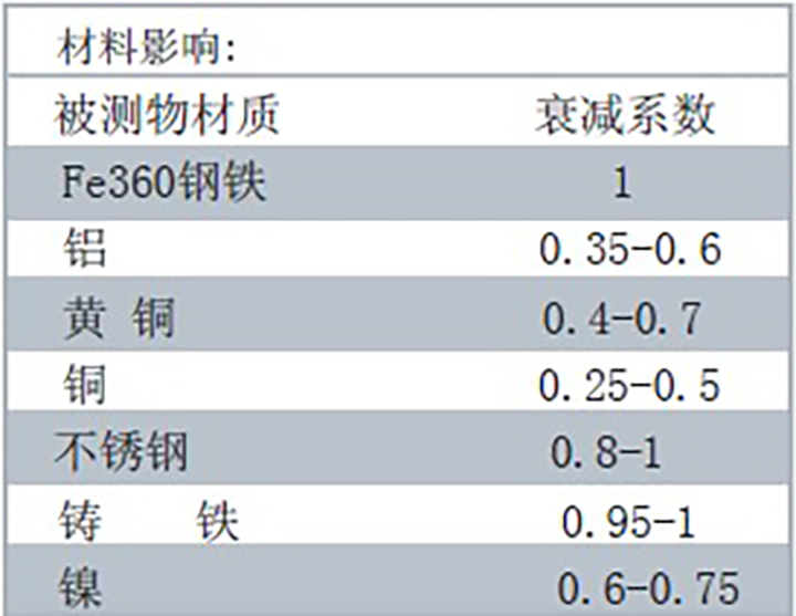 對電感式接近開關而言,檢測物材料的導電性是影響衰減系數(shù)的主要參數(shù)。下列數(shù)據(jù)給出了感應不同物體時,對應感應距離的衰減系數(shù)。