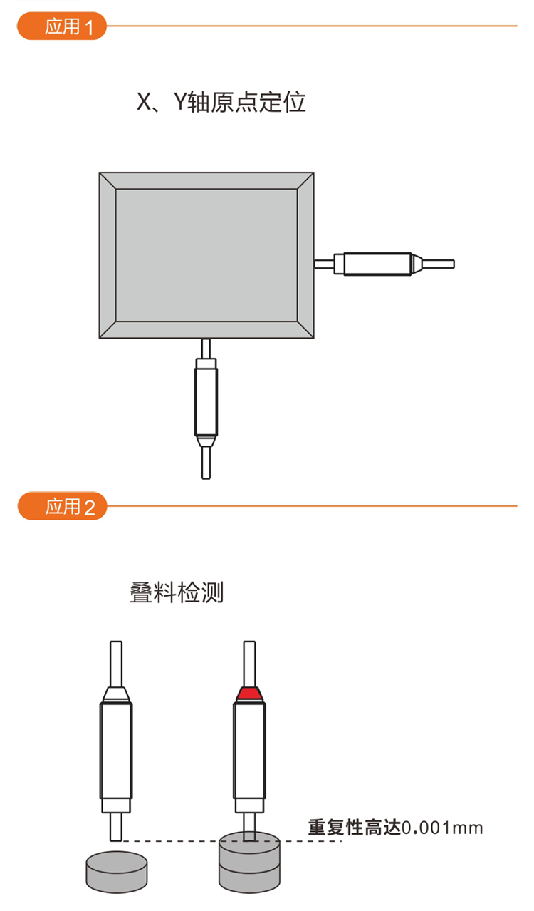 如X\Y軸定位,在物體運(yùn)動的X/Y軸上安裝該傳感器,當(dāng)物體朝軸方向運(yùn)動,按壓到傳感器后在觸發(fā)信號的位置輸出信號,再控制物體停止或做其他動作。