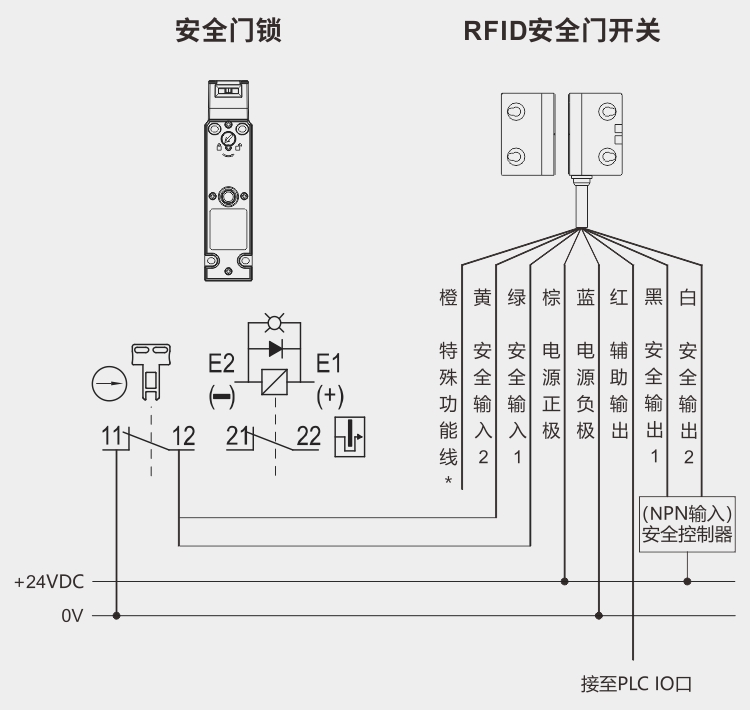 選型時(shí),我們需要關(guān)注鑰匙控制這一項(xiàng),選擇插鑰匙觸點(diǎn)導(dǎo)通的安全門(mén)鎖。然后進(jìn)行接線,接線時(shí)根據(jù)非接觸安全門(mén)開(kāi)關(guān)的類(lèi)型,比如NPN型的,我們?cè)诎踩T(mén)鎖的觸點(diǎn)接一邊負(fù)極,一邊接非接觸安全門(mén)開(kāi)關(guān)的信號(hào)輸入線,讓鑰匙插入時(shí)觸點(diǎn)導(dǎo)通,相當(dāng)于導(dǎo)通負(fù)極和開(kāi)關(guān)的信號(hào)輸入線。下面我們通過(guò)圖來(lái)了解接線。