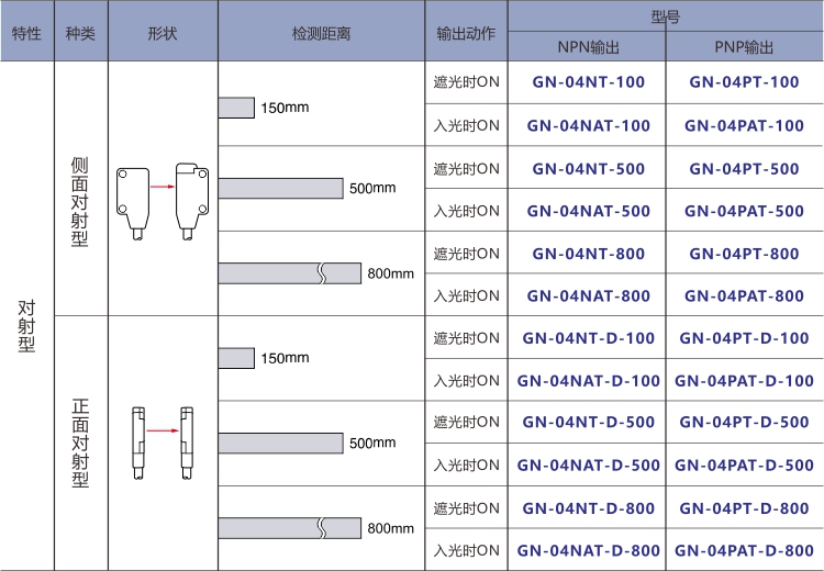 ECOTTER 超薄對(duì)射光電開關(guān) GN-04T系列 有正面對(duì)射和側(cè)面對(duì)射款,安裝距離(檢測(cè)距離)可選100mm\500mm\800mm,可根據(jù)應(yīng)用情況選擇。