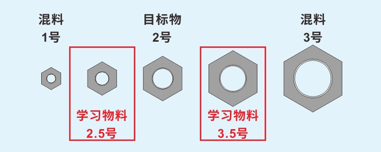 目標(biāo)物通過傳感器檢測區(qū)域時會以各種姿勢進(jìn)行,所以我們?yōu)榱吮苊饴z,經(jīng)常會選擇比原目標(biāo)物稍大和稍小的物料進(jìn)行學(xué)習(xí)。