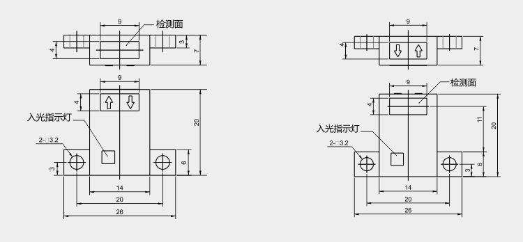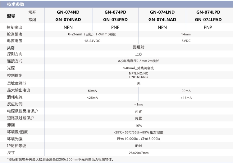 ECOTTER GN-07系列光電開關(guān) 提供了標(biāo)準(zhǔn)距離款與雙倍距離型號、上方檢測與前方檢測兩個檢測方向,可以根據(jù)不同的工況選擇對應(yīng)的款式。