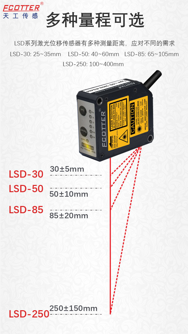 ECOTTER LSD系列 采用三角測量原理,激光束照射被測物體表面,反射光由接收透鏡聚焦到光敏元件。物體位移變化導(dǎo)致反射光斑位置移動,通過計算光斑位移量確定物體距離。