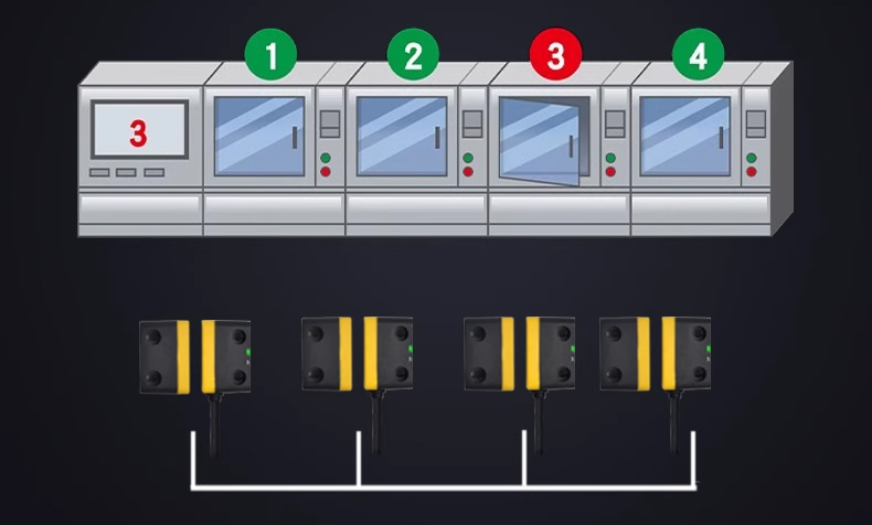 多個(gè)門通過級(jí)聯(lián)連接,可實(shí)現(xiàn)統(tǒng)一的安全輸出。確認(rèn)是否有其中一扇門的開閉狀態(tài)不正常。