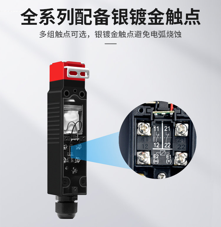 ECOTTER安全門鎖的鎖定力 強電磁式抗拉力強制鎖定力1300N以上。全系列標配復合銀鍍金觸點,避免電弧燒蝕,保證優(yōu)秀導電性能。安全門開關外殼采用PA66阻燃材質,耐高溫;電纜接頭防水;抗撞擊可選配金屬鎖頭加強防沖擊能力。