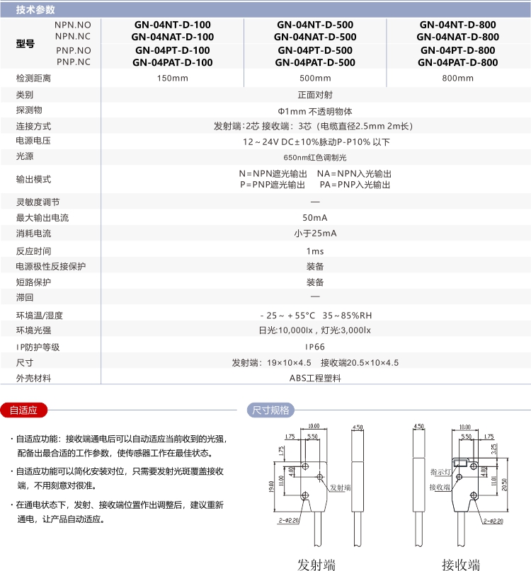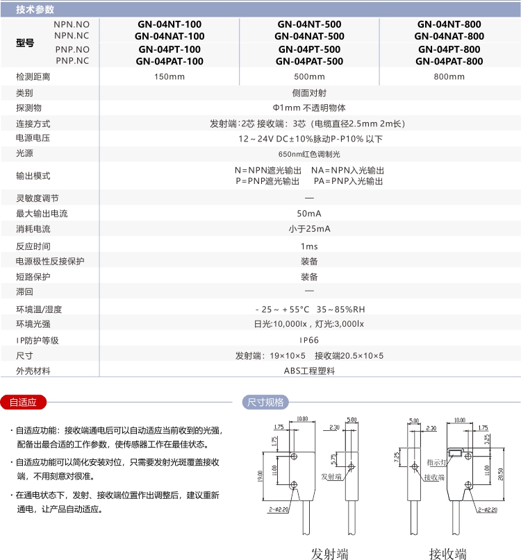 這款超薄光電是小光斑對射型,采用小光斑尺寸設(shè)計(jì),500mm處光斑僅為中30mm,并配備方便觀察的雙色指示燈--紅色電源指示燈與綠色輸出指示燈。
