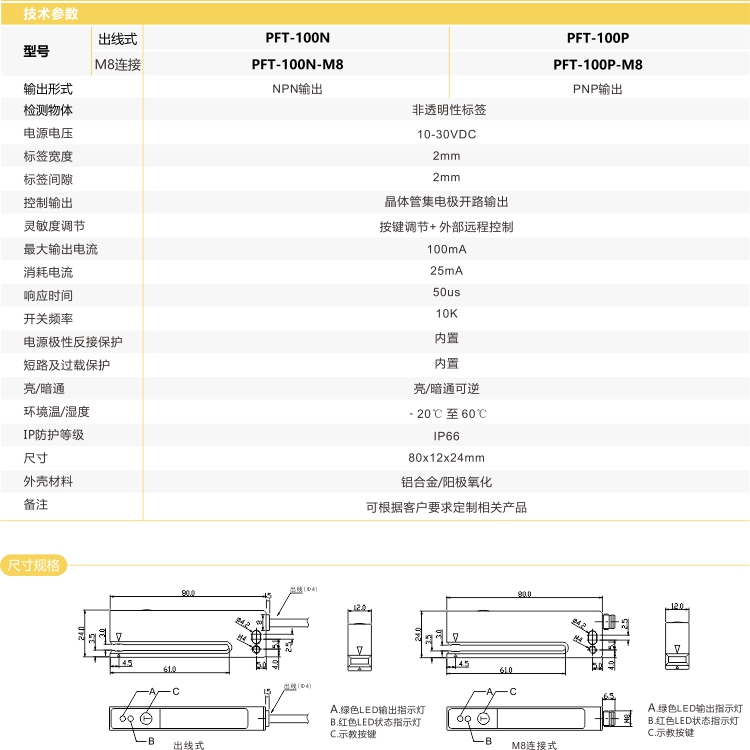 ECOTTER 光電標(biāo)簽傳感器 PFT-100系列 可以高速檢測(cè)標(biāo)簽達(dá)10Khz,常開常閉可切換,常開是檢測(cè)到標(biāo)簽輸出信號(hào),檢測(cè)到間隙停止信號(hào);常閉是檢測(cè)到間隙輸出信號(hào),長(zhǎng)按設(shè)置鍵8秒切換。