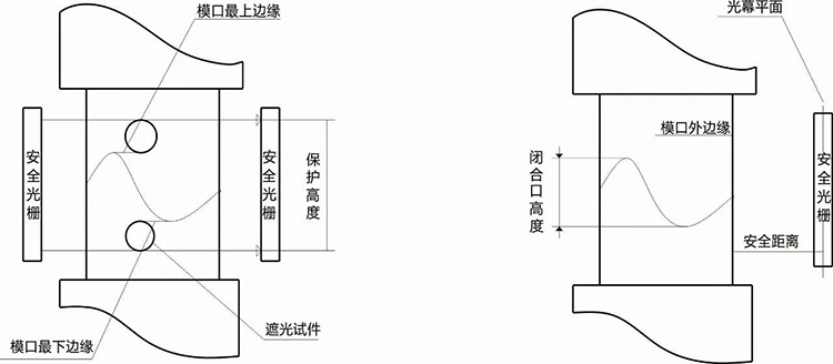 安全光幕高度位置是指安全光柵的光幕相對于機(jī)床上下模口的位置。在保證安全間隔的條件下,安全光柵的最下一束光不得高于模口下邊沿,最上一束光不得低于模口上邊沿。