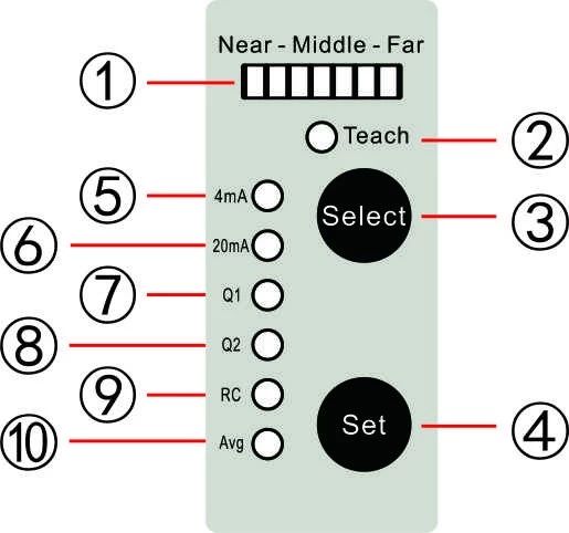 (3)將物體放在你想要測量的位置,并長按Set鍵5s,設(shè)定開關(guān)輸出狀態(tài)變化的位置。Q1(Q2)指示燈亮閃爍一次,說明設(shè)置成功;若指路示燈閃爍5次,說明設(shè)置失敗,需要重新設(shè)置;