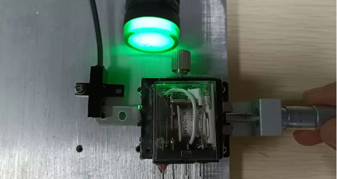 這里有一個(gè)重復(fù)精度測試儀器,我們可以通過旋動(dòng)標(biāo)尺推動(dòng)另一端的物塊前進(jìn),直到傳感器發(fā)出信號(hào),此時(shí)我們記錄下這個(gè)標(biāo)尺的位置。